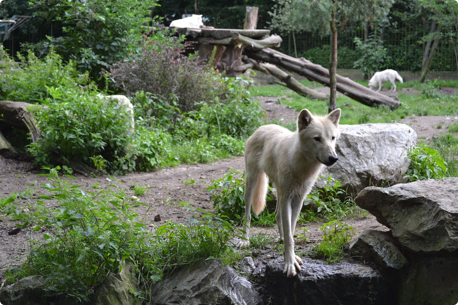 Sarki farkas (Canis lupus) a Duisburgi Állatkertben. Az alfaji keverék fehér farkasokkal közös kifutóban az Európában alig tucatnyi állatkertben bemutatásra kerülő alfaj, a Hudson-öböli farkas (Canis lupus hudsonicus) egy példánya is látható. A sarkvidéki bemutatót egészítik ki a hóbaglyok (Bubo scandiacus), a sarki rókák (Alopex lagopus), a rénszarvasok (Rangifer tarandus f. domesticus) és a rozsomákok (Gulo gulo gulo) kifutói és röpdéi is.