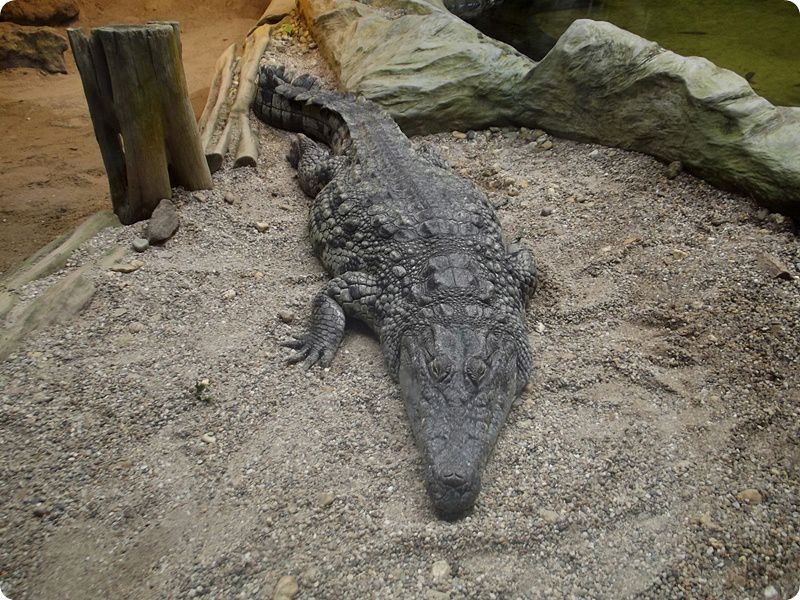 Az állatkertben tovább haladva három nagyobb, egymáshoz viszonylag közel lévő állatházhoz érünk. Ezek egyike a Krokodilház. Az épületet két ajtón át is meg lehet közelíteni, ezek – akárcsak az állatkert összes többi állatháza esetén – egyaránt bejáratként és kijáratként is funkcionálnak. A vendégeket mindkét bejáratnál kettős, fotocellás ajtó fogadja. Az épületbe belépve esőerdei környezet fogad bennünket, párás és meleg levegővel, buja növényzettel. A látogatói út korláttal határolt, innen letekintve, alámélyített férőhelyeken élnek a krokodilok. Engem a megoldás leginkább a Budapesti Állatkert Pálmaházában lévő aligátor-férőhelyre emlékeztetett. A különböző fajokat egymástól rács választja el. A férőhelyek tágasak, medencével és szárazföldi résszel egyaránt rendelkeznek, dús növényzetűek és infralámpákkal ellátottak, melyek az állatok kényelmét szolgálják. Három faj kapott itt helyet, az egyik oldalon fiatal Mississippi- v. más néven csukaorrú aligátorok (Alligator mississippiensis), a másik oldalon páncélos krokodilok (Crocodylus cataphractus), a központi csarnokkal szemben pedig nílusi krokodilok élnek. Az itteni nílusi krokodilok mindegyike az Európában ritkán tartott (mindössze hat állatkertben, Hallén kívül csak egy másik német állatkertben láthatóak) dél-afrikai nílusi krokodil (Crocodylus niloticus cowiei) alfajhoz tartozik. A páncélos krokodil szintén állatkerti ritkaság: egész Európában csak 16 állatkertben tartják, Németországban egyedül Halléban látható ez a faj. Megnyúlt szája, akárcsak a gaviálok esetében, elsősorban a halakra való vadászathoz alkalmazkodott. Az itt élő krokodilok azonban nem eszik meg a medencében élő, különféle afrikai sügéreket, nemcsak a páncélos krokodilok, hanem a többi faj sem. A halak a krokodilokat egymástól elválasztó rácsokon keresztül egyik férőhelyről a másikra tudnak úszni…
