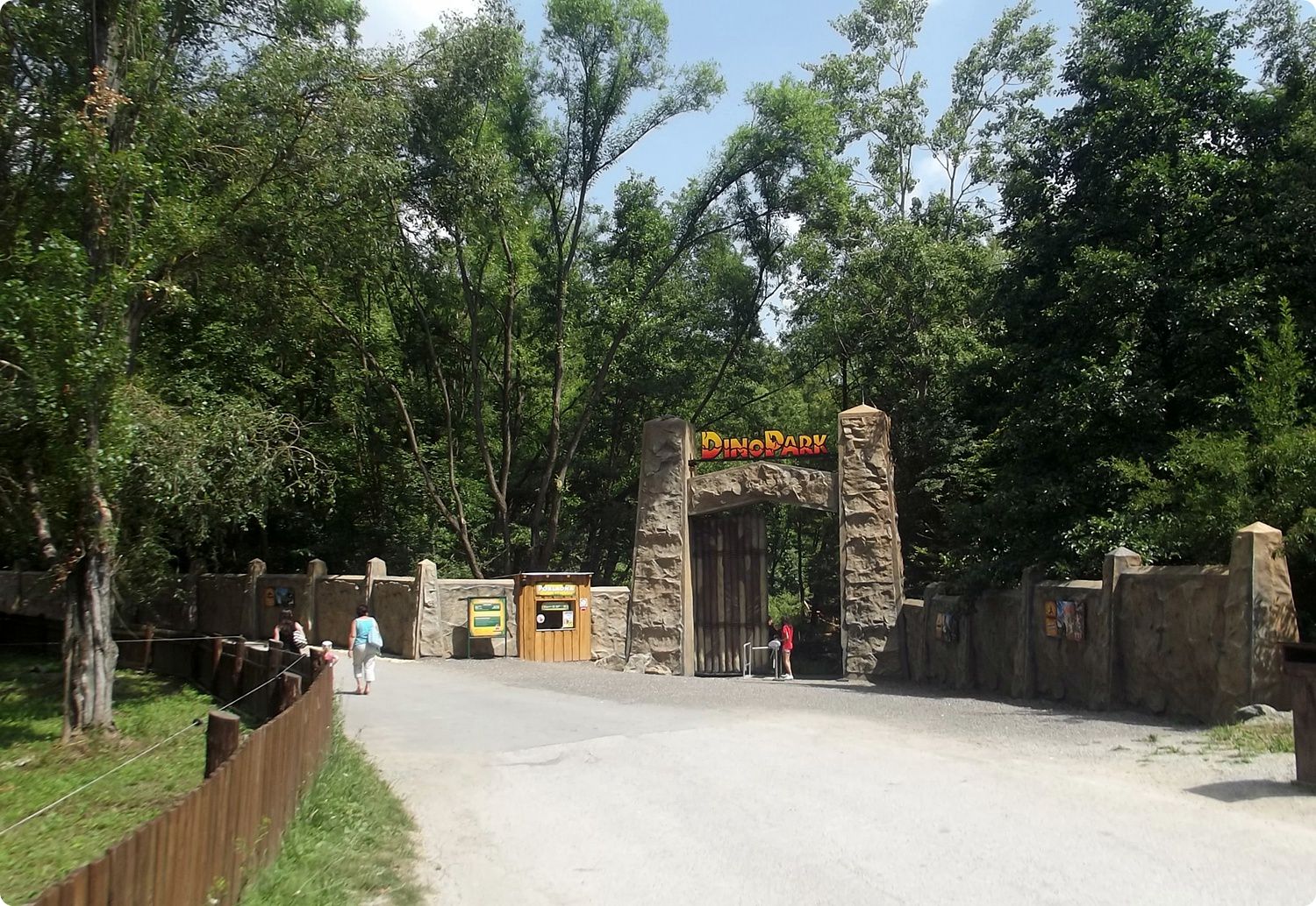 Már messziről feltűnik a Dinopark monumentális bejárata, mely szinte megszólalásig hasonlít a Jurassic Park című filmben látható kapura. A közönség figyelmét a folyamatosan hallható zene segítségével is igyekeznek a bejárat felé fordítani. A park külön belépő megvásárlásával látogatható, a bejáratnál éppen ezért egy jegypénztár is helyett kapott. Igaz, van lehetőség az állatkert főbejáratánál kombinált állatkerti és dinoparki belépőjegy váltására, a Dinopark azonban önállóan nem látogatható. A létesítmény az állatkert legújabb fejlesztése, 2013. június elsején adták át a nagyközönségnek. A kivitelező már számos hasonló parkot készített szerte Csehországban és Szlovákiában. A kassai Dinopark véleményem szerint nagyon jó lett, szobrok és robotok vegyesen találhatóak itt, méretükkel, esztétikus kialakításukkal segítenek elrepíteni az embert egy őskori túrára. Igaz, giccses elemektől sem mentes a bemutató, ám összességében a gyönyörű erdei környezetben elhelyezett dinoszauruszok jó benyomást tettek rám. A hatást tovább fokozza, hogy a nem mozgó, szobor dinoszauruszok többsége is ad ki hangot magából, kőnek álcázott hangszórók segítségével.