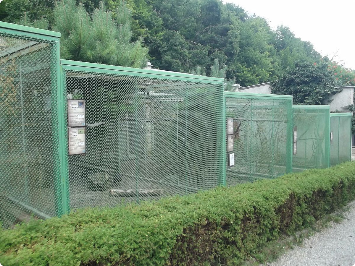 A ketrecsor között bújik meg az Exotárium bejárata, valamint a WC-k. A bejárathoz vezető elválasztó út után öt további ketrec látható, a látogatók az állatokat itt már belső férőhelyeiken is megtekinthetik. Valamennyi kifutó és röpde ugyanolyan kialakítású, mint a korábban látottak. Az első férőhelyet Liszt-tamarinok (Saguinus oedipus) lakják, a külső és a belső férőhelyük is megfelelő méretű, tágas és jól berendezett. Az aprócska majmok után két nagyméretű papagájfaj következik, két-két jákó (Psittacus erithacus) és sárga-kék ara (Ara ararauna). A ketrecsor negyedik tagjában már nagyobbacska főemlősökkel találkozhatunk. A vegyesfajú kifutóban jelenleg egy hím fehérhomlokú barnamaki (Eulemur albifrons) és egy hím fekete-fehér vari (Varecia variegata variegata) lakik. A két makit ugyanakkora alapterületű ketrecben tartják, mint a Liszt-majmokat, igaz ugyan, hogy gazdagon berendezett, ám a félmajmok véleményem szerint lakhatnának ennél némileg tágasabb férőhelyen is…