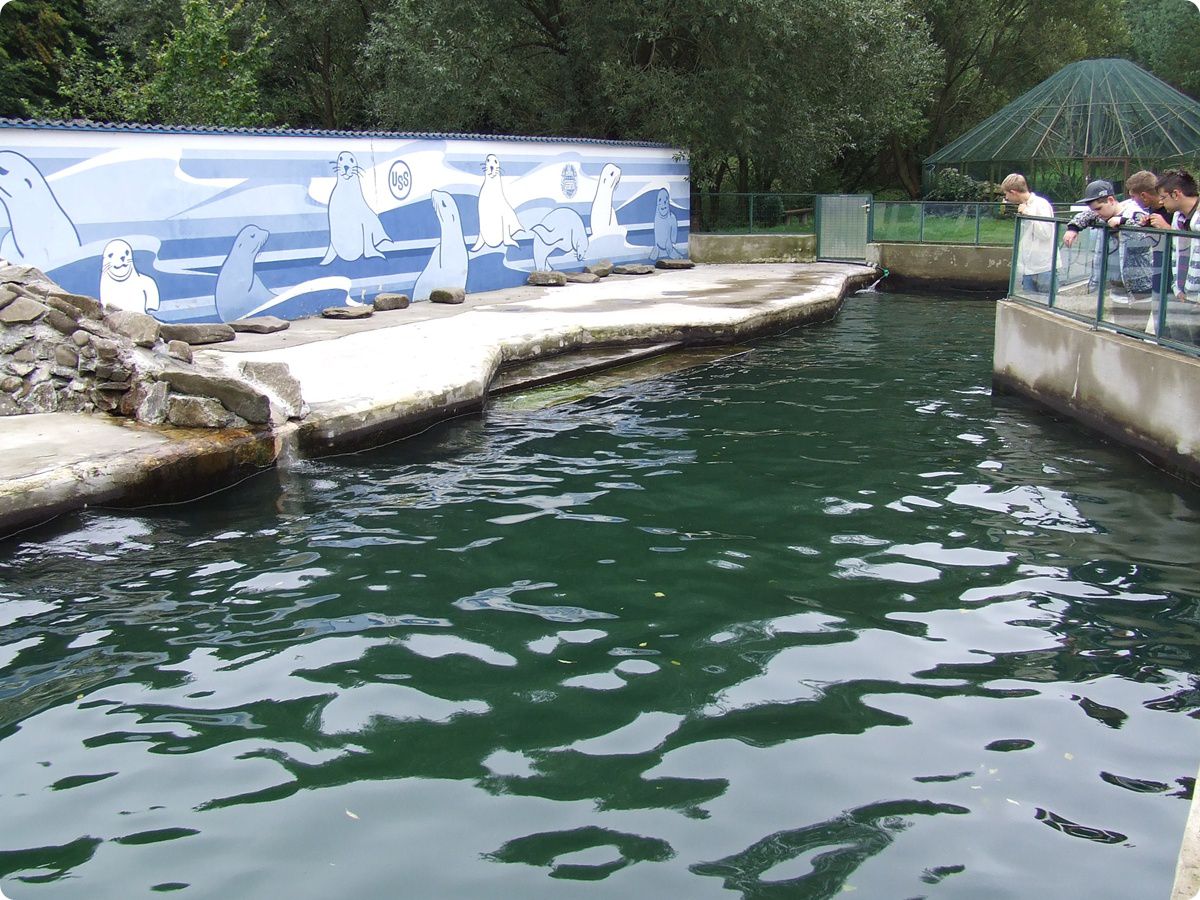 Az oroszlánokkal szemben épült fel a fókák helye, amely nagyon egyszerű kivitelezésű, egy közepes méretű medencéből és a hozzá tartozó – nagyrészt beton – szárazföldi részből áll. Az egyhangúságot csak egy kis, sziklákból kialakított mesterséges dombocska töri meg, melyen egy kis vízesés csordogál le a medencébe. Az összhatást tovább rontja a kifutó hátfalára festett, giccses, fókákat ábrázoló festmény is, sőt itt az állatok víz alatti mozgásának megfigyelésére sincs lehetőség. Szlovákiában jelenleg csak Kassán találkozhatunk fókával, az állatkertben jelenleg két hím kúpos fókát (Halichoerus grypus) tartanak. E fókafaj a szabad természetben a hideg égövben, illetve a mérsékelt égöv északi részén fordul elő, igen jól bírja a hideget, éppen ezért a kassai fókák számára sem készült belső férőhely. A kúpos fóka a közismertebb borjúfókánál (Phoca vitulina) jóval nagyobbra nő, nevét jellegzetes, kúp alakú fejéről kapta. Ott jártamkor sajnos nagyon piszkos volt a medence vize, a fókákat csak levegővételnél lehetett látni néhány pillanatra, holott nagyon kíváncsi voltam rájuk, e fókafajjal ugyanis most először találkoztam élőben. Az állatokkal naponta kétszer tartanak bemutatót, a népszerű „fóka-show” során a közönség közelebbről is megismerheti az állatkert népszerű lakóit.
