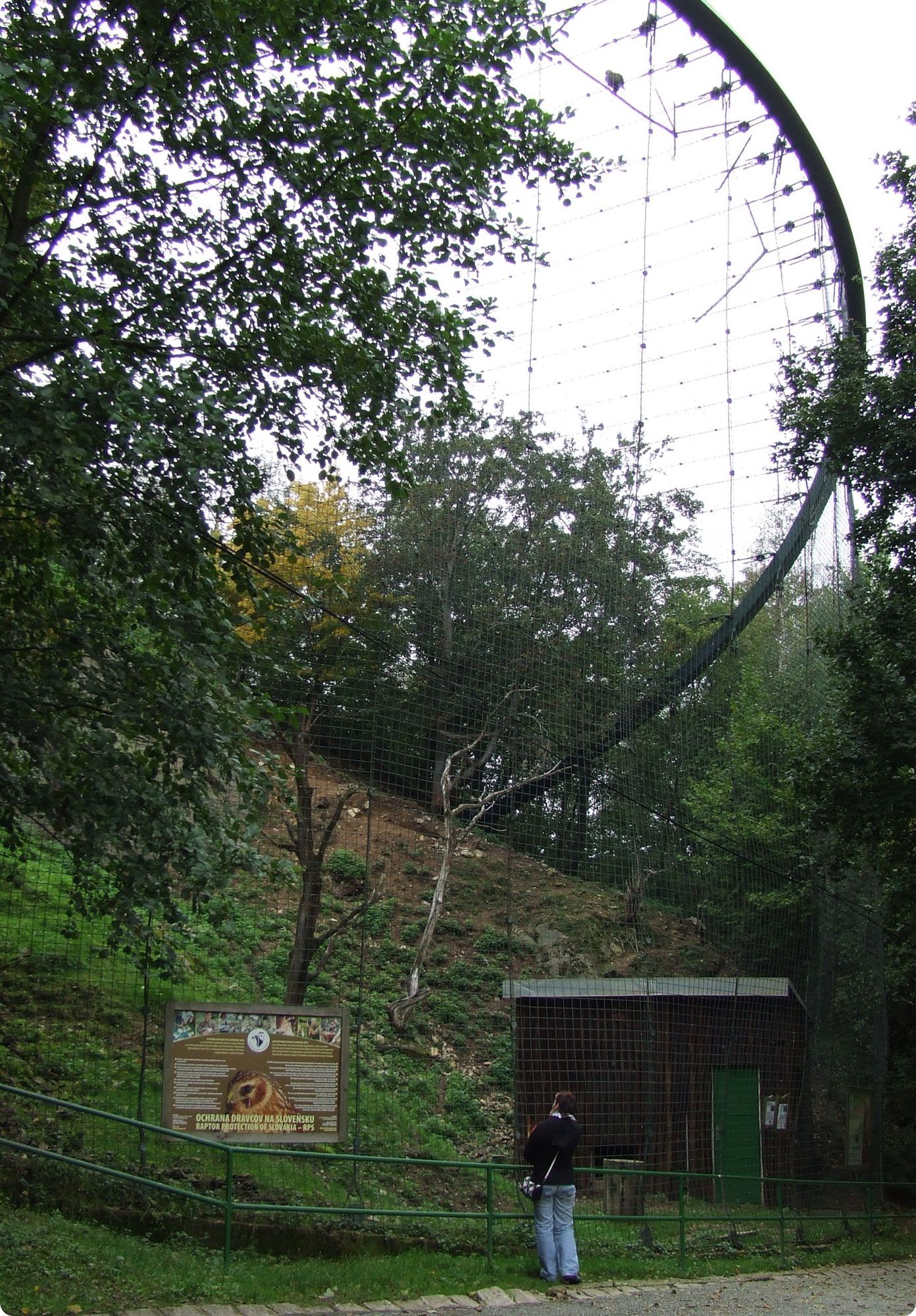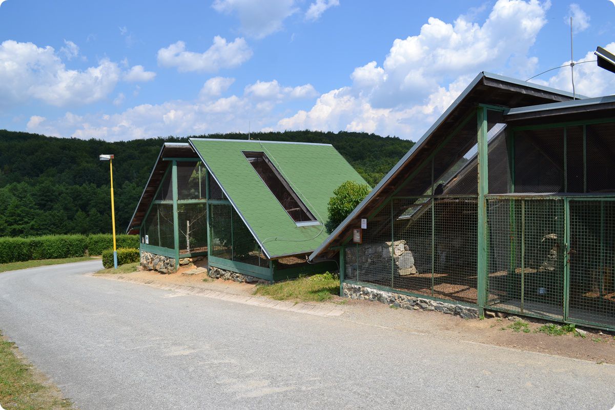 A teknősök után érünk el a ragadozó madarak bemutatóihoz. Az itteni röpdék – egy kivételével – egyáltalán nem mondhatók tágasnak. Itt két férőhelyen parlagi sasok (Aquila heliaca) láthatóak, a harmadikban pedig hatalmas méretű szakállas baglyok (Strix nebulosa). A viszonylag kicsi madárlakhelyek után felüdülés a negyedik, óriási röpde látványa. A bemutató Szlovákia legnagyobb madárröpdéje. Korábban számos, megmentett és szabadon engedés előtt álló szirti sast (Aquila chrysaetos) rehabilitáltak itt, a kedvező körülmények között a madaraknak lehetőségük volt újra megtanulni repülni.