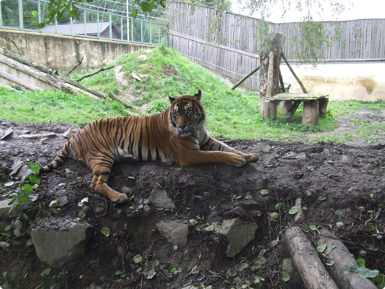 Az oroszlánkifutóhoz hasonlóan lett kialakítva a tigriskifutó, melyet a látogatók szintén megtekinthetnek lentről és felülről is (védőkorlát ennél a kifutónál sem található). A Kassai Állatkertben jelenleg egyetlen, szibériai -szumátrai alfaji keverék hím tigris (Panthera tigris) él. A kis kifutó bár füves, viszonylag szegényes berendezésű. A tigris számára medence sem készült, csak egy apró, a kifutón keresztül folyó patakban pancsolhat a csíkos nagymacska. A tigrisházhoz két másik belső férőhely is csatlakozik. Ezek egyike, akárcsak a hozzá kapcsolódó külső kifutó jelenleg üresen áll, korábban az állatkert mosómedvéje (Procyon lotor) lakott itt, amíg végleges kifutója el nem készült) . A másik, aprócska kifutó, melyre a látogatók csak felülről nézhetnek le, a foltos hiéna (Crocuta crocuta) otthona. Az állatkertben jelenleg egyetlen, idős hím hiénát tartanak. A faj jelenleg csak itt látható Szlovákiában.