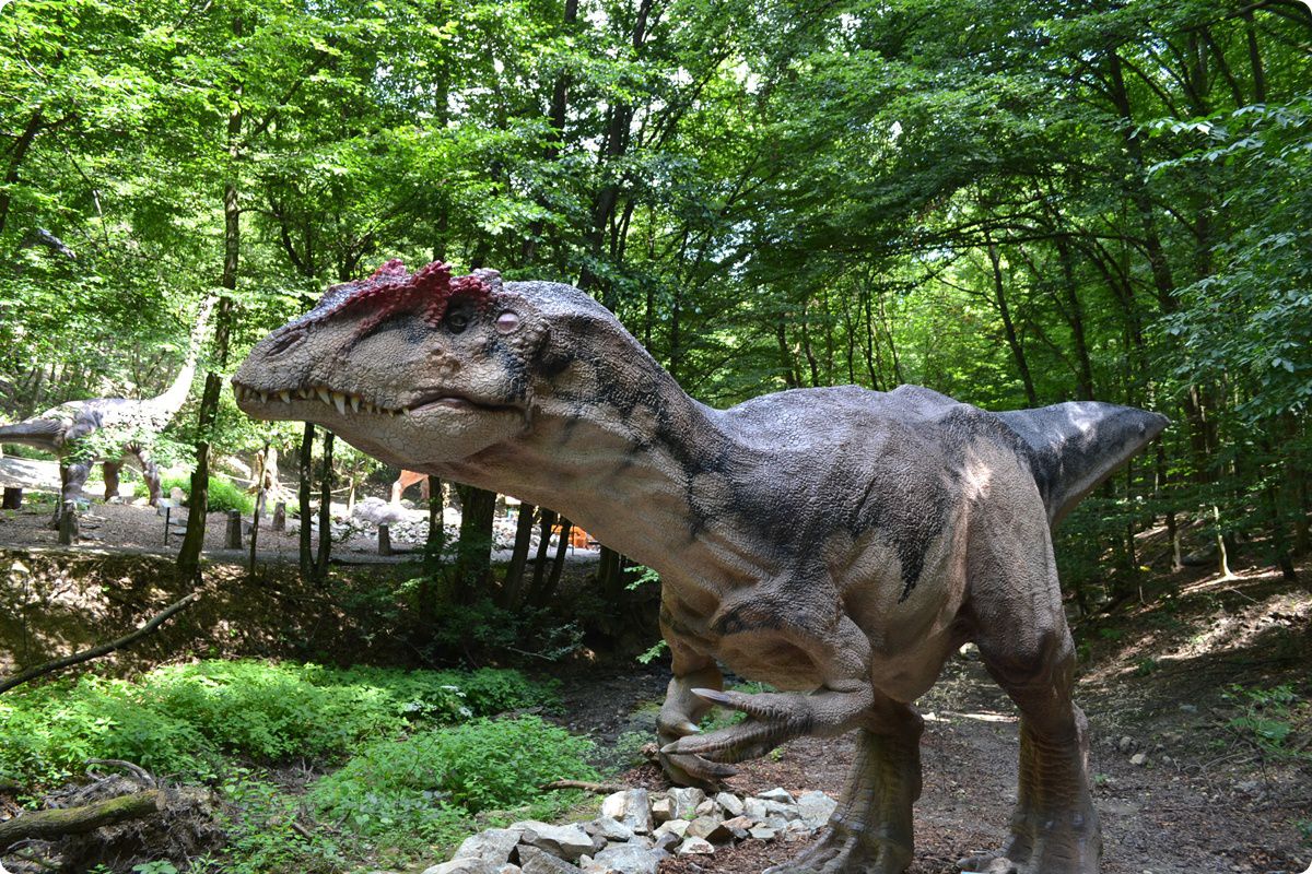 A mozit megkerülve érünk el az Allosaurushoz, mely egyike a park azon dinoszauruszainak, ahol a közönség nem talál védőkorlátot, nyugodtan ismerkedhet a szoborral, vagy akár fényképészkedhet is a rettegett ragadozóval. Egy hegyi emelkedőn tovább sétálva érünk el a Deinonychus-okhoz. A viszonylag kistermetű ragadozók csoportja egy dinotetemen falatozik jóízűen. Ez a faj és közeli rokonai (a Dromeosauriák, közismertebb nevükön „raptorok”) a feltételezések szerint falkában vadásztak, mint a ma élő farkasok vagy oroszlánok. Tovább sétálva érünk el a fák között küzdő Pachycephalosaurusokhoz (melyek állítólag a mai juhfélékhez hasonlóan küzdöttek, a küzdő felek fejükkel rohanhattak egymásnak, éppen ezért a Dinoparkban is így ábrázolták őket). A mélybe lepillantva a patak partján az őskori óceánokban egykor élő ragadozó hüllőt, a Liopleurodont láthatjuk. A termetes ragadozó modellje úgy lett kialakítva mintha éppen az ősóceánban úszkálna, a mozgása, a víz közelsége és a hanghatások is mind-mind ezt az érzetet igyekeznek elősegíteni.
