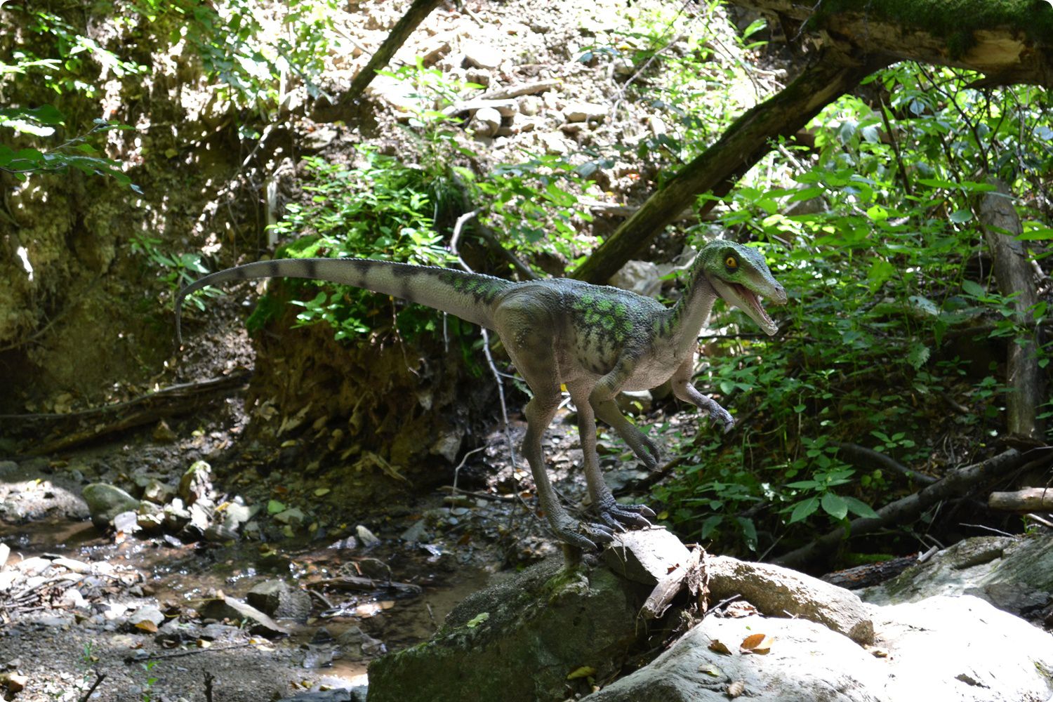 A Dinopark legnagyobb „lakói” a hatalmas Brachiosaurusok, melyek úgy mozgatják nyakukat és fejüket mintha éppen a fák ágait legelnék- mintha csak a Jura időszakban járnánk, és a valaha élt legnagyobb szárazföldi állatok egyikét figyelnénk. Egy ketrecbe zárt Deinonychus is található a patak partján, a másik „Fotosaurus”, ugyanis mellé is bemehetnek a látogatók a ketrecbe közös képet készíteni. Ha ezt a lenti, patak mellett kanyargó ösvényt választjuk a továbbhaladásra, kis idő múlva elérünk a Parasaurolophus-családhoz. A szobrok úgy lettek kialakítva, mintha ezek a dinoszauruszok is éppen a patak partján legelésznének. Mellettünk egy meredek domboldal húzódik, melyen éppen egy csapat Comsognathus ereszkedik le. A csapat néhány tagja már a patak fölötti ágakon egyensúlyozik. A Comsognathus nevű ragadozó egyike a legkisebb ismert dinoszauruszoknak. Méret tekintetében nem sokkal maradnak le tőlük a patak partján sütkérező óriási őskétéltűek, a Gerrothoraxok sem.