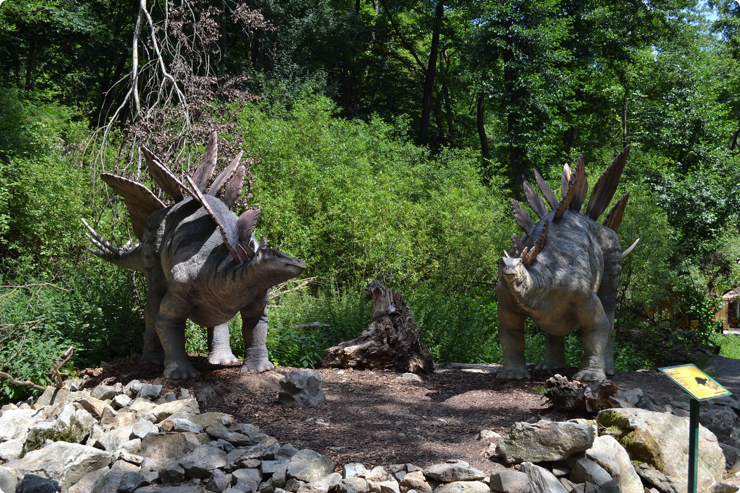A bejáraton belépve először a Chasmosaurusok csoportjához érünk. Ezek a dinók mozgatják a fejüket, hangot is adnak, sőt a készítők még lélegzés-imitációt is terveztek beléjük, élethűen mozgatják oldalukat (az összhatást csak az rontja kissé, hogy a fejük nyikorog, amikor éppen emelgetik). Egyébként ezek a dinók, mint az összes többi a parkban, mozgásérzékelősök: csak akkor „produkálják” magukat, ha látogató halad el mellettük. A Chasmosaurusok szomszédságában Stegosaurusok kis csoportja kapott helyet. Ők már jóval „nyugodtabbak”, nem mozognak, csupán kellemesen „dúdolgatnak” egymással. Itt balra fordulva az erdő belsejébe vezet az utunk, ahol nem messze a patak partján egy újabb Stegosaurus-szobor is helyet kapott, mely úgy lett kialakítva, mintha éppen a patakból inna. Mellette egy nagyméretű Sauropoda dinoszaurusz, egy Diplodocus vívja haláltusáját: a készítők úgy alakították ki a szobrot, mintha az állat éppen beleragadt volna a mocsárba és menekülni próbálna.