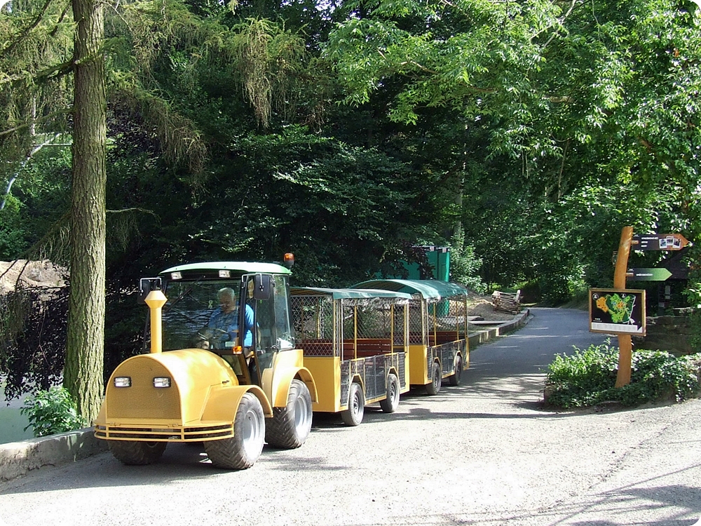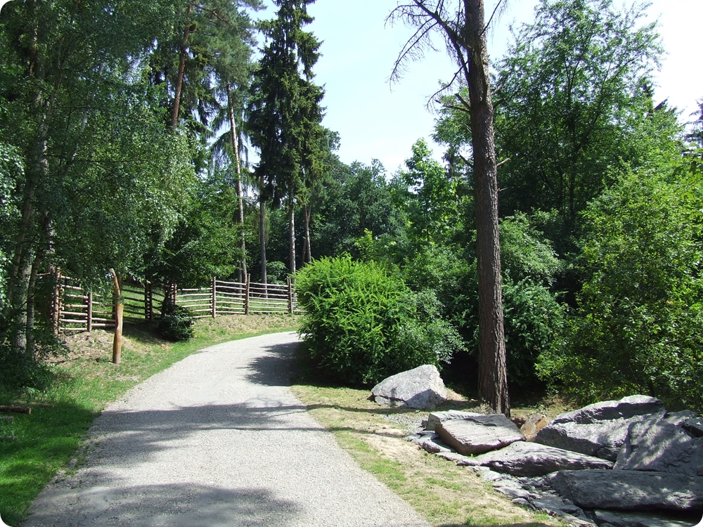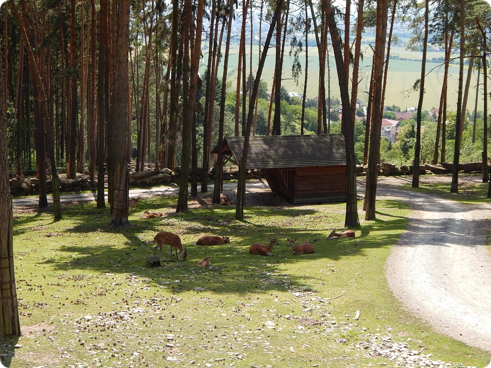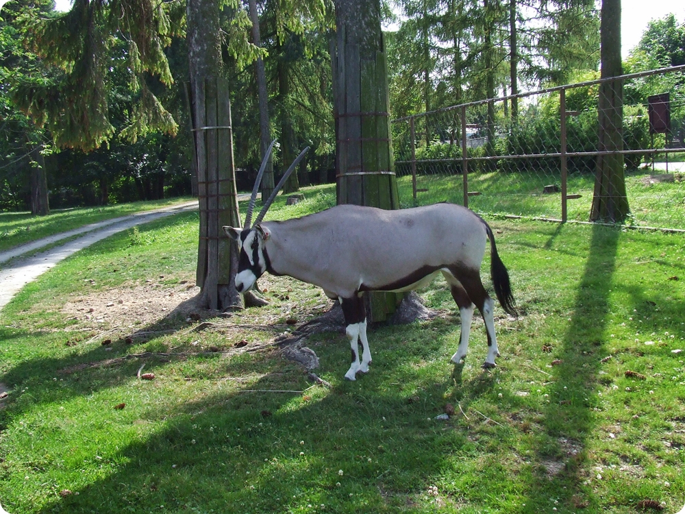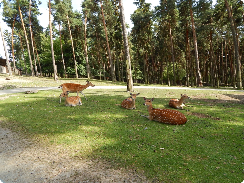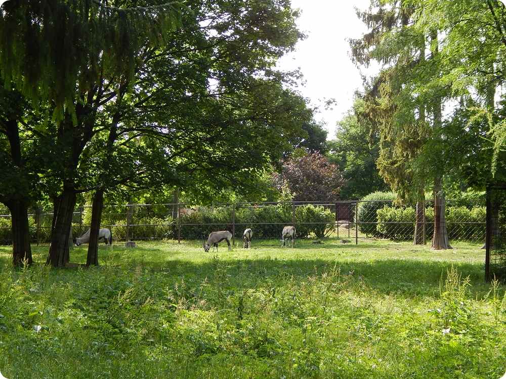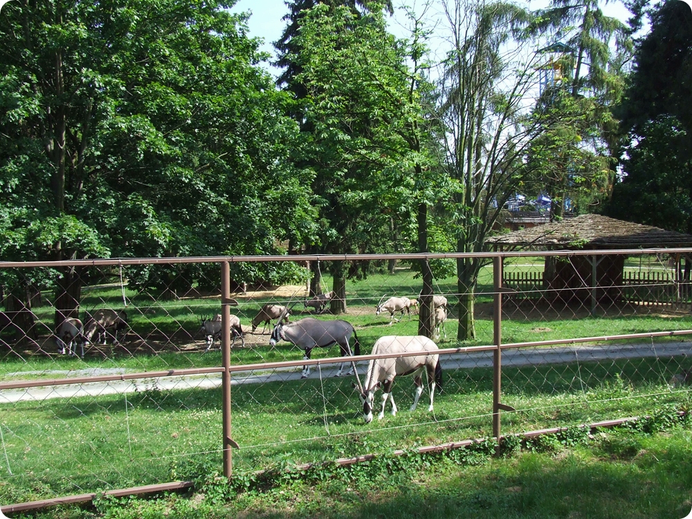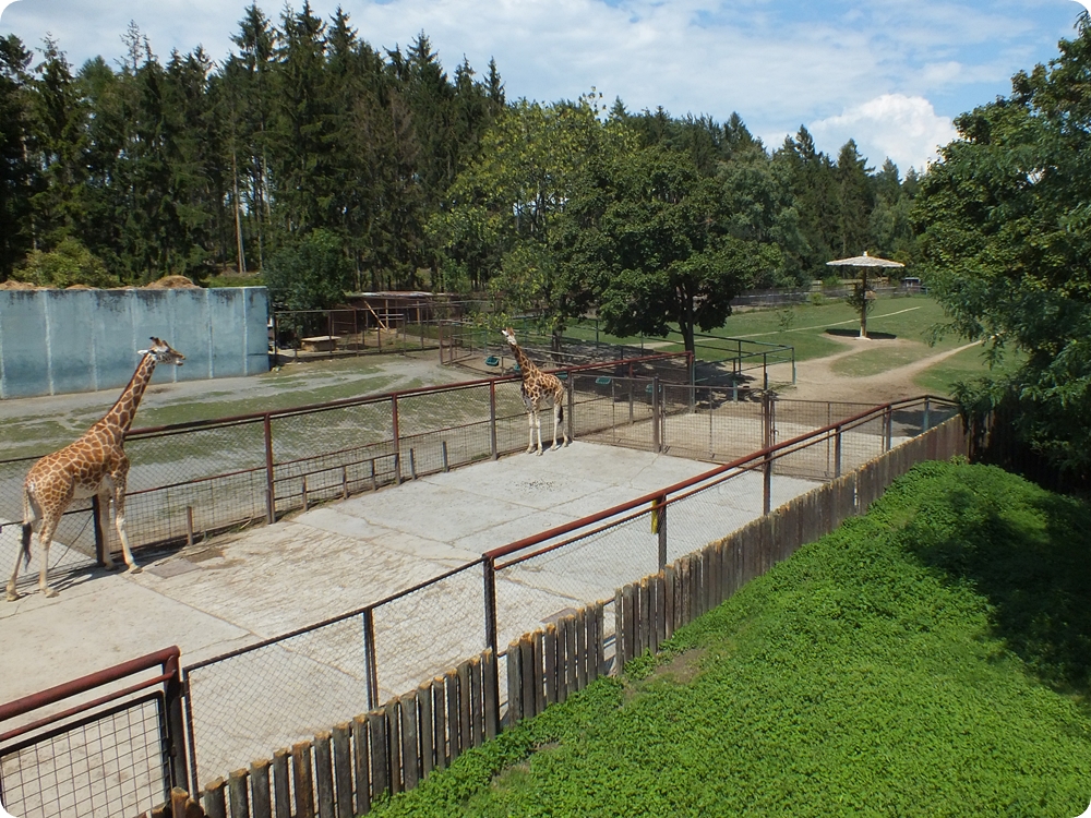 A kisragadozósorral párhuzamosan találjuk az Eurázsia Szafari kifutósorát, melyre gyalogosan csak innen tudunk vetni egy pillantást. A terület egy még jelenleg is kidolgozás alatt álló koncepció része, mely végül 19 hektáros területet érint majd, és öt nagyobb témavilágot dolgoz fel (Eurázsia, Afrika, Észak-Amerika, Ausztrália, Északi-sarkvidék). A terv szerint ezeket szafariparkszerűen tekinthetik meg a látogatók a kert által üzemeltetett járművel utazva. A projekt első fázisa 2013-ban valósult meg az Eurázsia Szafari megnyitásával, melyet két évvel később követett az Afrika Szafari, végül az Észak-Amerika Szafari csírájaként az egykor főleg kutyaféléket bemutató kifutósor helyén kialakított farkaskifutó átadásával folytatódott 2020-ban: a 1,5 hektáros területen jelenleg egy nyolc tagú, kizárólag hímekből álló falka él. Az Eurázsia Szafari területileg jelenleg a legnagyobb, 17 korábbi kifutó átépítésével valósulhatott meg. Egy nagy közös térben muflonok (Ovis orientalis musimon), vietnámi szikaszarvasok (Cervus nippon pseudaxis), mezopotámiai dámszarvasok (Dama mesopotamica) és bezoárkecskék (Capra aegagrus) élnek, tőlük leválasztott kisebb kifutóban pedig nyugat-kaukázusi kecskék (Capra caucasica), jávorszarvasok (Alces alces), illetve európai bölények (Bison bonasus) láthatóak. Az általam egyébként se preferált szafaripark-érzést (személy szerint szeretek annyi időt tölteni egy állat mellett, amennyit én szeretnék, és nem mozgó járműből nézni és fényképezni az állatokat) jelentősen csökkenti, hogy a jávorszarvasokat és a bölényeket a szafarijárműből is csak kerítésen keresztül lehet megpillantani, ráadásul a mozgó „kisvonatból” szinte lehetetlenség a fotózásuk. Sajnos az utóbbi két fajra gyalogosan is csak nagyon messziről, a nagy kifutó felett áttekintve vethetünk egy-egy pillantást. Maga az utazás a Kalahári Pavilon mellett indul, itt tudunk jegyet váltani, melynek jelenlegi ára 50 cseh korona. A Szafari kezdeti szakasza, Afrika számomra szintén kissé csalódást keltő: valójában két szakaszból áll, az első szakaszon a zsiráfkifutó mellett haladunk el, tehát itt is csak faágakból készült, bár afrikai boma hangulatát utánzó kerítés felett átpillantva látjuk az állatokat, a Rothschild-zsiráfokat (Giraffa camelopardalis rothschildi), majd a második szakaszban a dél-afrikai nyársasantilopok (Oryx gazella gazella) kifutójába térünk be. Bár az antilopok férőhelye nem kicsi, mégsem elég terjedelmes ahhoz, hogy a vadon illúzióját, egy valódi szafariutazás élményét nyújtsa. A dél-afrikai patások egyébként csak késő tavasztól kora őszig láthatóak a kifutóban, a hűvösebb hónapokat egyenként elszeparálva, külön boxokban töltik. A kisvonat útvonala az antilopokat elhagyva aztán a látogatói útvonalon kanyarog egészen az Eurázsia Szafari területéig.