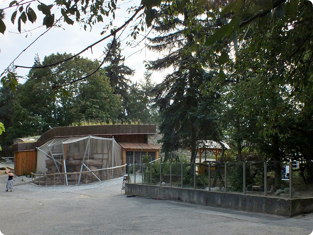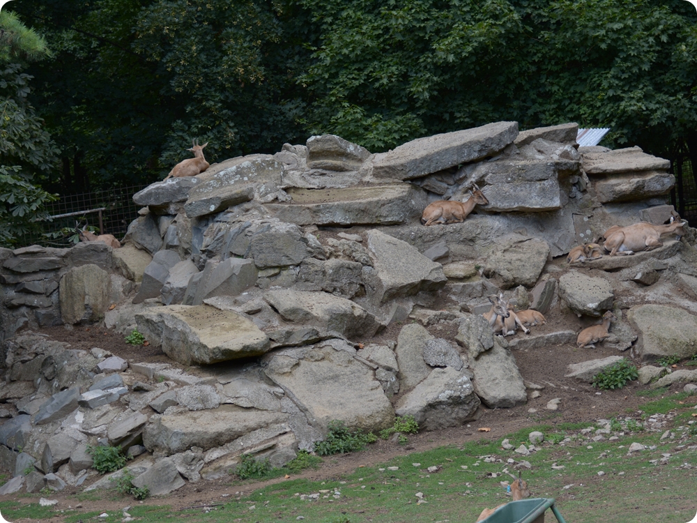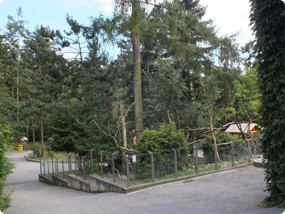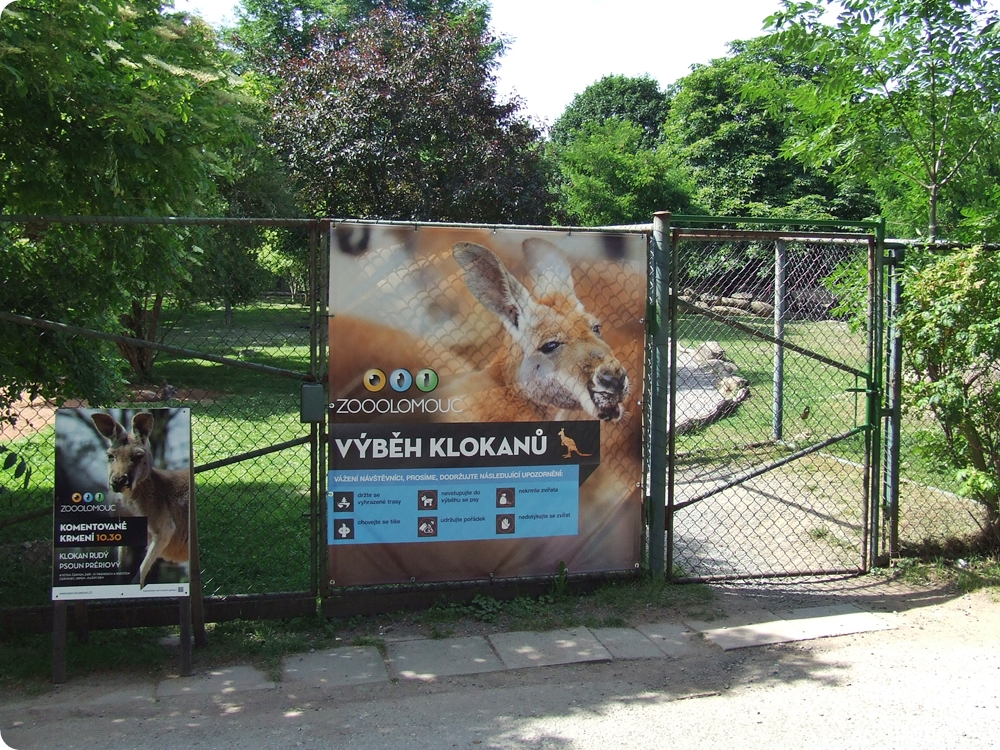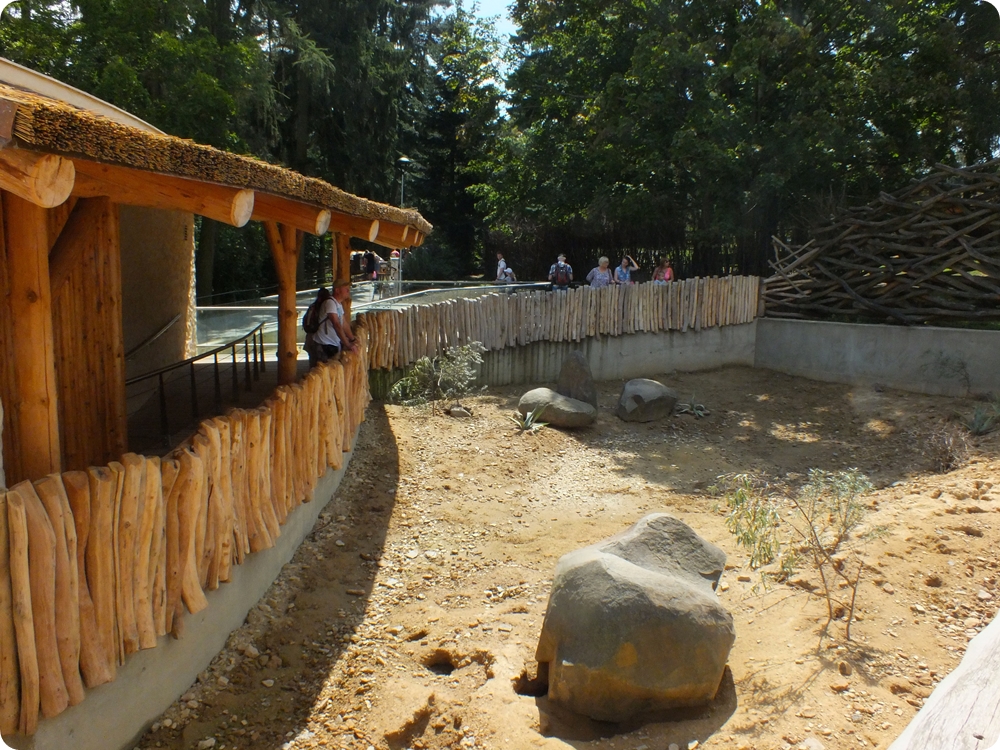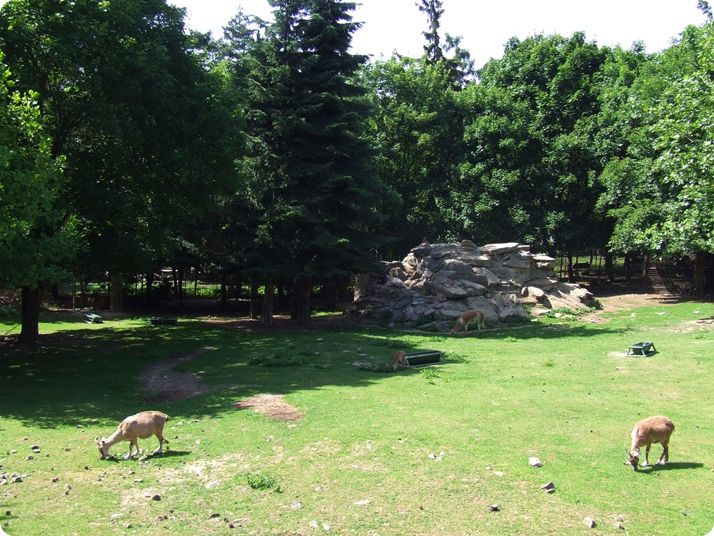 A Ragadozók Pavilonja mögötti ösvényt követve először a pödröttszarvú kecskék (Capra falconeri heptneri) kifutójához érünk. A viszonylag nagy alapterületű férőhely látogatóktól távolabbi végében mesterséges sziklaépítmény szolgál a kecskék birodalmául, melyet a magasan futó látogatói útról szemlélhetünk. Mellette a vikunyák (Vicugna vicugna) kifutóját találjuk. Sajátos, és némileg kellemetlen megoldással találkozunk a szomszédos kifutóban: a látogatók felé eső részen a struccok (Struthio camelus) láthatóak, a látogatóktól távol, dróthálós kerítéssel és sűrű növényzettel leválasztott területen pedig a kert legizgalmasabb állatainak egyike: a fehérfarkú gnúk (Connochaetes gnou) tenyészcsapata él. Számomra az olmützi állatkert egyik legnagyobb vonzerejét ez a faj jelentette, tekintve hogy bár jó néhány állatbemutatót meglátogattam határon belül és azon kívül az utóbbi években, fehérfarkú gnúkhoz sosem volt szerencsém. Sajnos ebben az esetben is csak alig kivehetően láthattam az állatokat, fotózni pedig a távoli drótkerítésen és sűrű növényzeten keresztül gyakorlatilag lehetetlen, így lekerülhetett ugyan a faj a „bakancslistáról”, de csak némi hiányérzettel. Azt viszont el kell ismerni, hogy a nyugodt körülmények közt tartott gnúk jól szaporodnak, ott jártunkkor is több borjú élt a csordával.