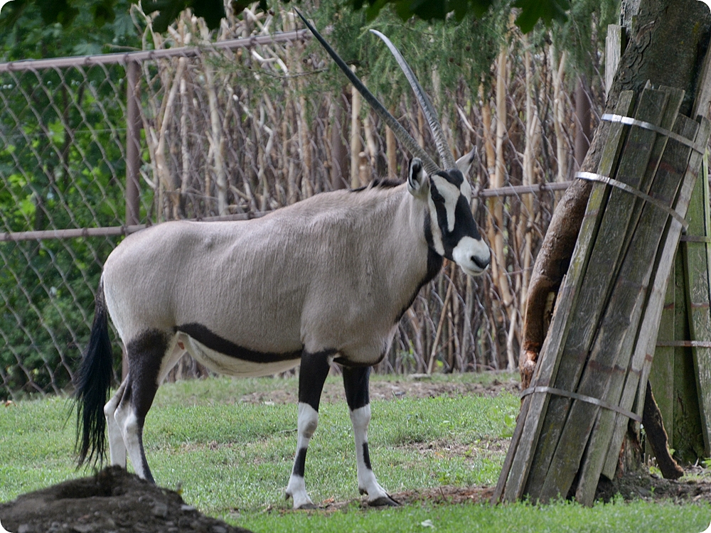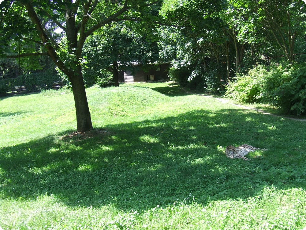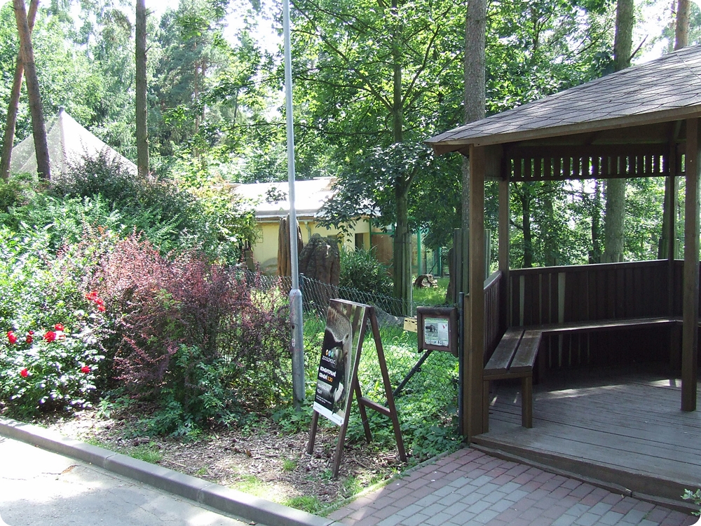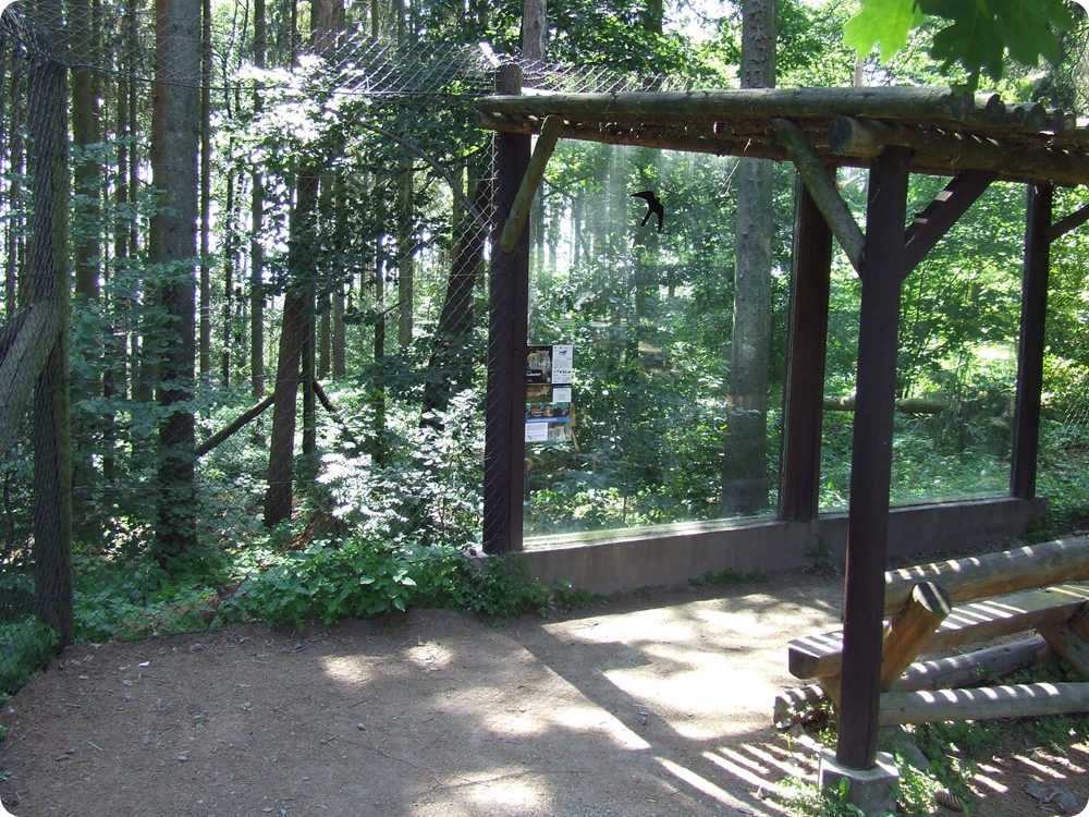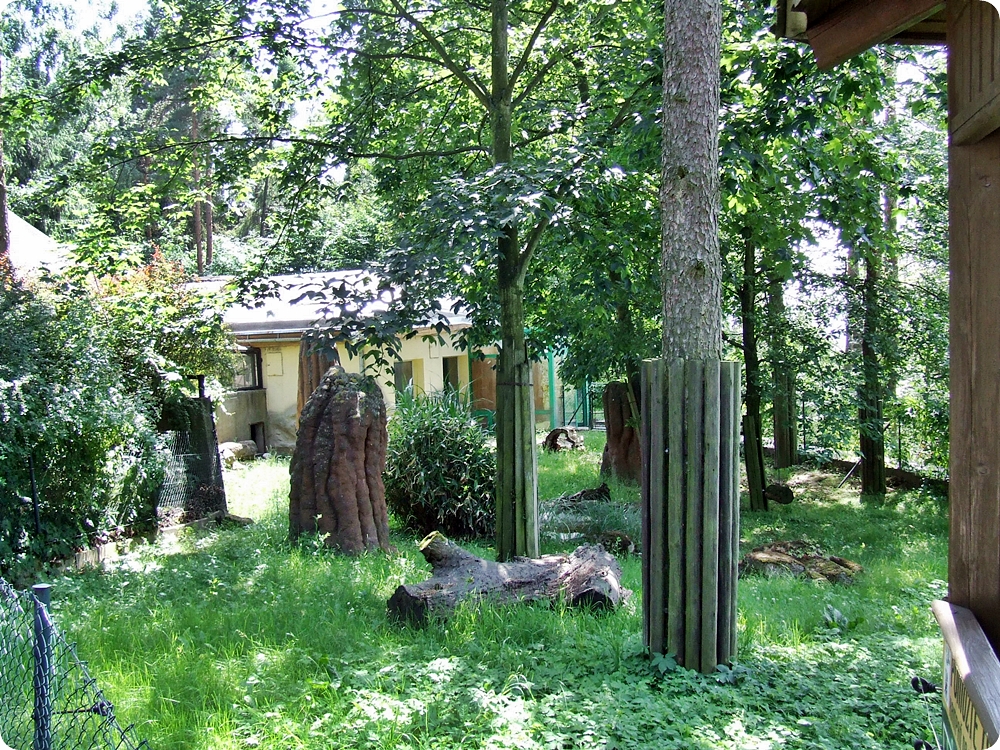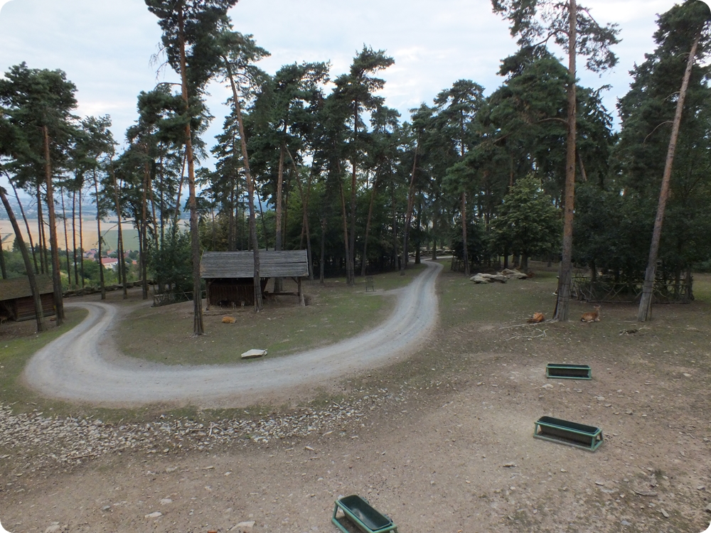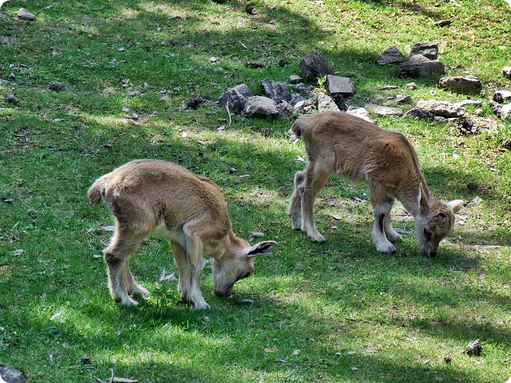 A Ragadozók Pavilonja mögötti ösvényt követve először a pödröttszarvú kecskék (Capra falconeri heptneri) kifutójához érünk. A viszonylag nagy alapterületű férőhely látogatóktól távolabbi végében mesterséges sziklaépítmény szolgál a kecskék birodalmául, melyet a magasan futó látogatói útról szemlélhetünk. Mellette a vikunyák (Vicugna vicugna) kifutóját találjuk. Sajátos, és némileg kellemetlen megoldással találkozunk a szomszédos kifutóban: a látogatók felé eső részen a struccok (Struthio camelus) láthatóak, a látogatóktól távol, dróthálós kerítéssel és sűrű növényzettel leválasztott területen pedig a kert legizgalmasabb állatainak egyike: a fehérfarkú gnúk (Connochaetes gnou) tenyészcsapata él. Számomra az olmützi állatkert egyik legnagyobb vonzerejét ez a faj jelentette, tekintve hogy bár jó néhány állatbemutatót meglátogattam határon belül és azon kívül az utóbbi években, fehérfarkú gnúkhoz sosem volt szerencsém. Sajnos ebben az esetben is csak alig kivehetően láthattam az állatokat, fotózni pedig a távoli drótkerítésen és sűrű növényzeten keresztül gyakorlatilag lehetetlen, így lekerülhetett ugyan a faj a „bakancslistáról”, de csak némi hiányérzettel. Azt viszont el kell ismerni, hogy a nyugodt körülmények közt tartott gnúk jól szaporodnak, ott jártunkkor is több borjú élt a csordával.