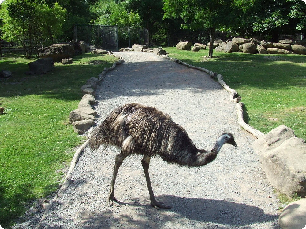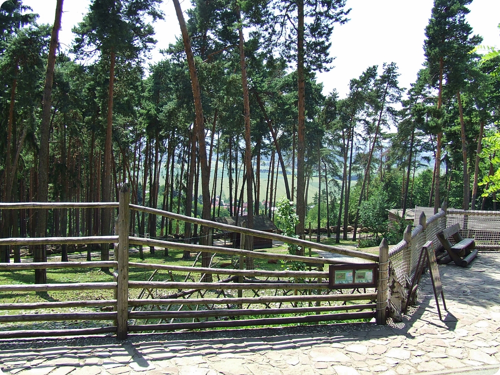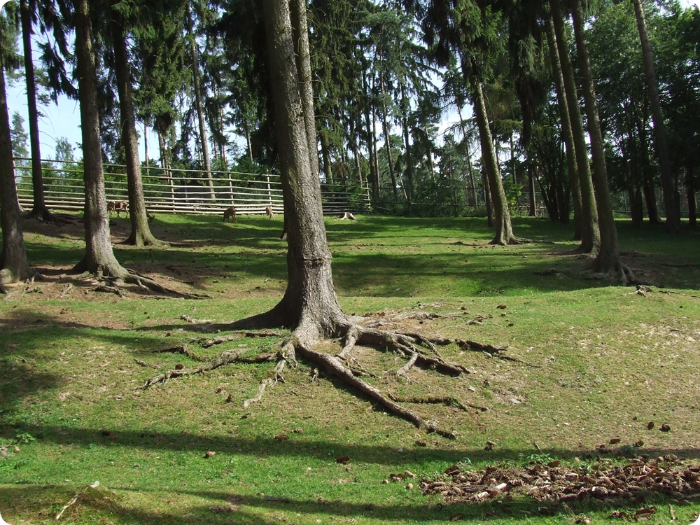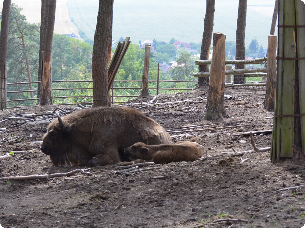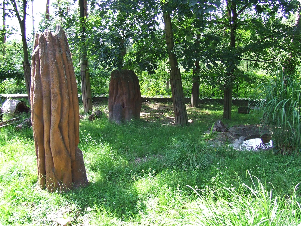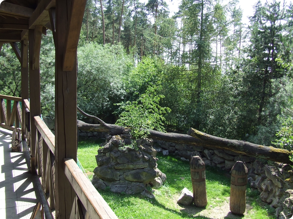 A Ragadozók Pavilonja mögötti ösvényt követve először a pödröttszarvú kecskék (Capra falconeri heptneri) kifutójához érünk. A viszonylag nagy alapterületű férőhely látogatóktól távolabbi végében mesterséges sziklaépítmény szolgál a kecskék birodalmául, melyet a magasan futó látogatói útról szemlélhetünk. Mellette a vikunyák (Vicugna vicugna) kifutóját találjuk. Sajátos, és némileg kellemetlen megoldással találkozunk a szomszédos kifutóban: a látogatók felé eső részen a struccok (Struthio camelus) láthatóak, a látogatóktól távol, dróthálós kerítéssel és sűrű növényzettel leválasztott területen pedig a kert legizgalmasabb állatainak egyike: a fehérfarkú gnúk (Connochaetes gnou) tenyészcsapata él. Számomra az olmützi állatkert egyik legnagyobb vonzerejét ez a faj jelentette, tekintve hogy bár jó néhány állatbemutatót meglátogattam határon belül és azon kívül az utóbbi években, fehérfarkú gnúkhoz sosem volt szerencsém. Sajnos ebben az esetben is csak alig kivehetően láthattam az állatokat, fotózni pedig a távoli drótkerítésen és sűrű növényzeten keresztül gyakorlatilag lehetetlen, így lekerülhetett ugyan a faj a „bakancslistáról”, de csak némi hiányérzettel. Azt viszont el kell ismerni, hogy a nyugodt körülmények közt tartott gnúk jól szaporodnak, ott jártunkkor is több borjú élt a csordával.