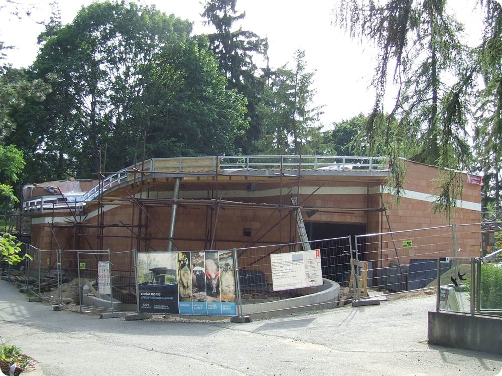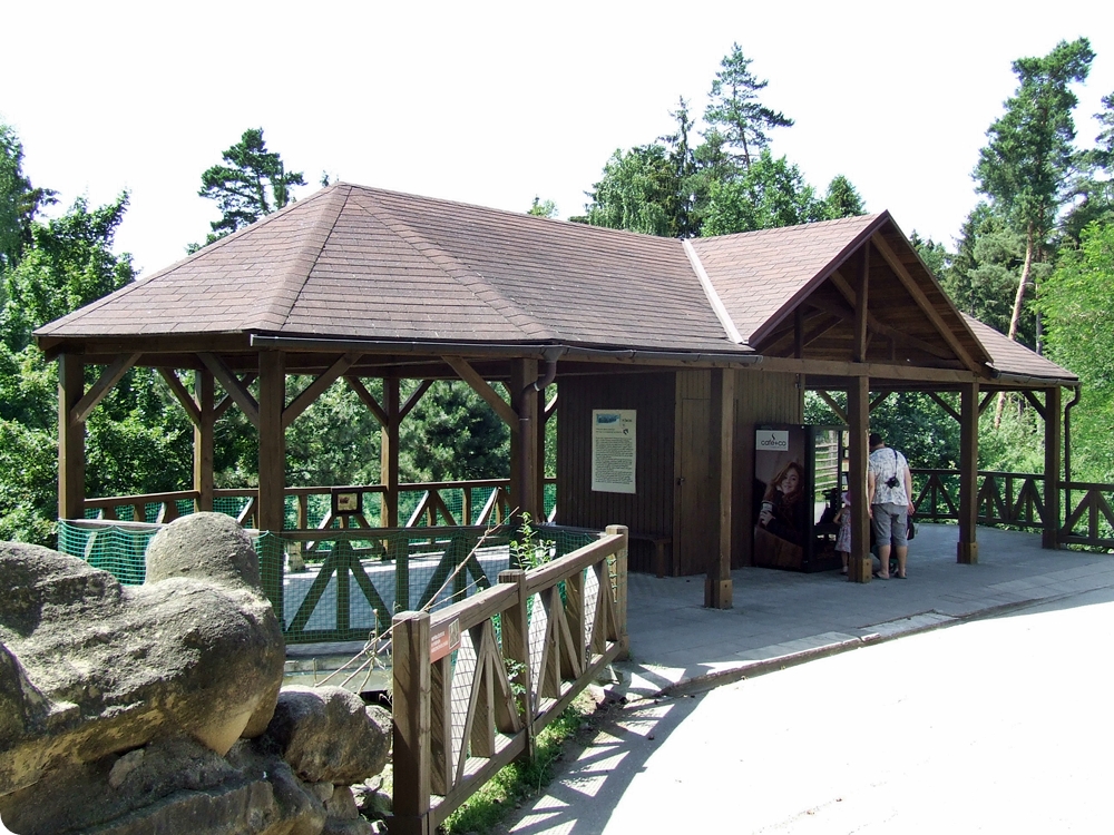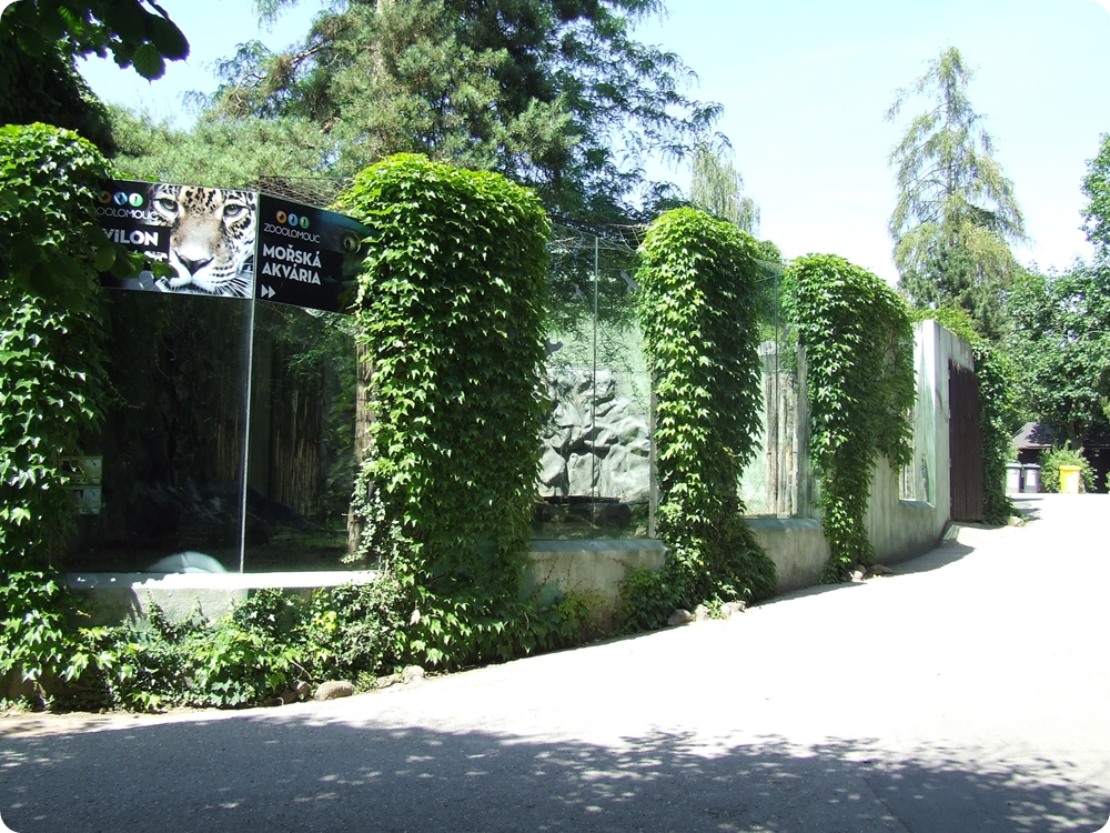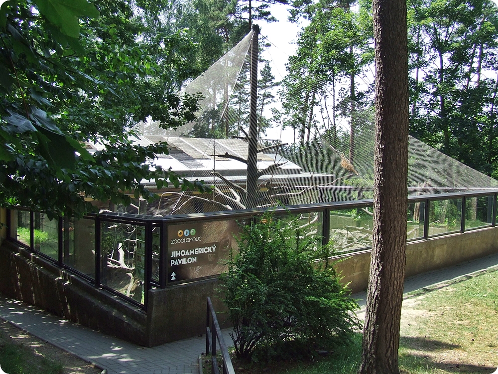 A Ragadozók Pavilonja (az idősebb korosztály számára talán ismerős, azonos című csehszlovák film forgatási helyszíne) történetét tekintve az állatkert egyik legrégebbi épülete, magját 1968-ban adták át, azonban az azóta eltelt idő alatt számtalan átépítésen és bővítésen esett át, a ’80-as években pedig Csehszlovákia legmodernebb ilyen jellegű épületének számított. Ekkor készült el a ragadozók belső kifutóival szemközti oldalon a kisebb-nagyobb akváriumokból és terráriumokból álló kiállítás is. Mai formáját a 2001 és 2003 között végzett átalakítással érte el, amikor is az állatokat a látogatóktól elválasztó rácsokat üvegre cserélték, illetve a ház tetején világítóablakokat helyeztek el. Az eredetileg itt található kisebb terráriumok a Zsiráfházba költöztek, így lehetőség nyílt egy nagy, 42.000 literes tengeri akvárium létrehozására, melyben a fő szenzációt jelentő feketeúszójú szirticápa (Carcharhinus melanopterus) és fehéruszonyú szirticápa (Triaenodon obesus) mellett több mint száz korallszirti hal úszkál. Az épület végében nagyszerű bemutatót alakítottak ki a tompaorrú krokodilok (Osteolaemus tetraspis) számára. A ház fő szenzációját azonban mégis a ragadozók jelentik. Az üvegen át megtekinthető, nem túl nagy, de elfogadható méretű, műsziklával dekorált férőhelyeken binturongok (Arctictis binturong), a jaguár (Panthera onca) normál színű és fekete színváltozata, illetve a berber oroszlánok (Panthera leo leo) élnek. Utóbbi tartása és tenyésztése komoly hagyományokkal bír Olmützben, rendszeresen születnek kölykök, ott jártunkkor is szerencsénk volt egy, a látogatók számára mindössze néhány napja bemutatott kölyökhöz. Az épülethez csatlakozó, üvegtáblákon át megtekinthető külső kifutók sajnos nem túl tágasak, de a lehetőségekhez képest szépen berendezettek. A szibériai tigrisek (Panthera tigris altaica) egy kisebb és egy nagyobb külső kifutót is birtokolnak, melyek közül a nagyobban kisebb medence is rendelkezésre áll, a látogatók számára ablakon keresztül megtekinthető belső férőhelyük a két külső között található. Érdekesség, hogy a hím, Amur „magyar” ősökkel rendelkezik, 2012-ben született Nyíregyházán, akárcsak a 2009-es születésű jaguár, Inti. A Ragadozók Pavilonjától kissé távolabb két további macskaféle kapott helyet. A dél-afrikai gepárdok (Acinonyx jubatus jubatus) tágas, füves kifutóban élnek, sőt már szaporodtak is. Az egyébként vasrácsos kerítéssel határolt férőhely kis nádfedelű kunyhót utánzó, üvegfalú betekintőn keresztül szemlélhető meg igazán zavartalanul. Vele szemben a kárpáti hiúzok (Lynx lynx carpaticus) modern, új kifutója található. Mivel a kerítés a 2019-es vihar során a rádőlő fáktól jelentősen megrongálódott, az állatok egy ideig nem használhatták a területet, mára viszont újra birtokba vehették azt. A közelben találjuk a betonfalú egykori medveárkot, amely a közelmúltban rövid időre újra egykori lakóinak adhatott otthont: két európai barnamedvét (Ursus arctos arctos) koboztak el a hatóságok, miután engedély nélkül hozták be őket az ország területére. A két fiatal állat először a Prágai Állatkertbe került, onnan költöztek Olmützbe, mielőtt továbbutaztak volna végleges helyükre, egy medvemenhelyre.