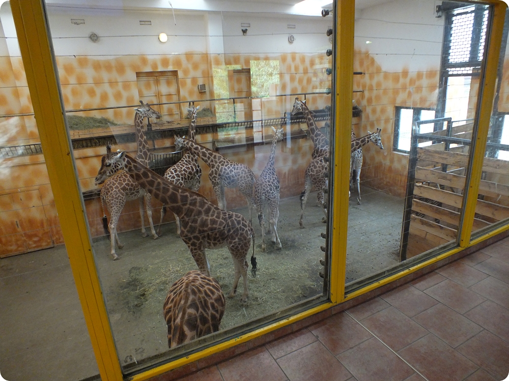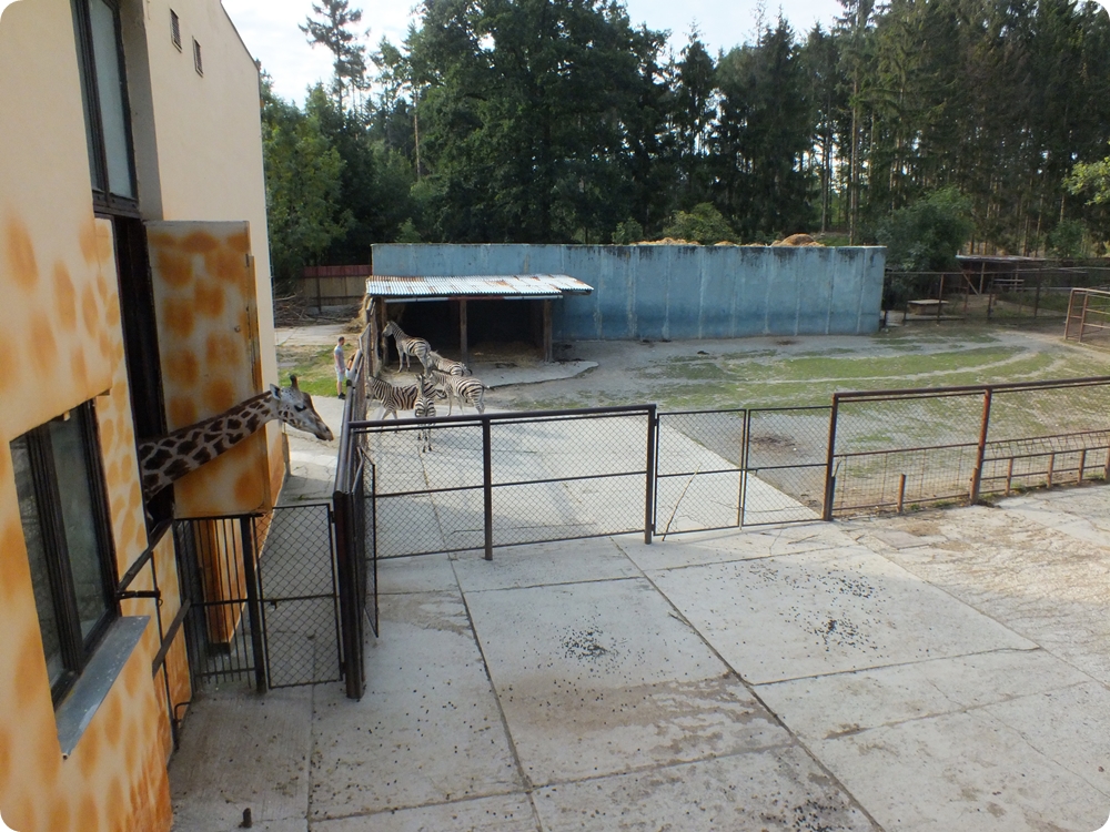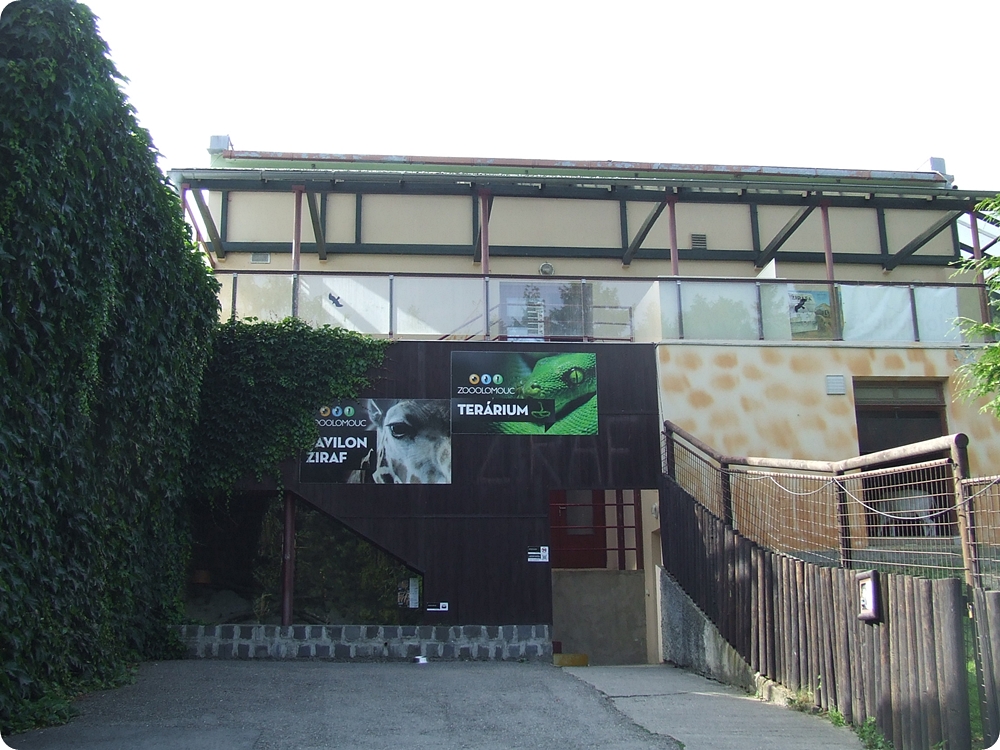 Az állatkert utolsó nagyobb egységét a Zsiráfház és annak környéke képezi. Az épületet 1977-ben adták át, a fő attrakciót jelentő, a ház központi csarnokában elhelyezett zsiráfok mellett az évtizedek során különféle antilopok és zebrák bemutatására is szolgált. A zsiráfok megnövekedett száma miatt az 1990-es években a házhoz új szárnyat építettek, az eredeti épülethez közvetlenül kapcsolódó termet a látogatók egy lépcsősor meghódítását követően belülről is megtekinthetik egy üveges, galériaszerű lelátóról. A Rothschild-zsiráfok (Giraffa camelopardalis rothschildi) csapata látogatásunkkor 13 állatot számlált. Az oldalszárnyakban, látogatók számára nem megtekinthető épületrészekben a már említett dél-afrikai nyársasantilopok (Oryx gazella gazella) téli szállásai mellett mendeszantilopok (Addax nasomaculatus), ecsetfülű disznók (Potamochoerus porcus) és Chapman-zebrák (Equus quagga chapmani) belső férőhelyei találhatók. Az épülethez 2006-ban csatolták hozzá azt a kilátóteraszt, melyről a zsiráfkifutó addig látogatók számára nem látható részére nyílik kilátás. A nem túl mutatós, dróthálós kerítéssel szögletes alakzatban lekerített, betonozott aljzatú zsiráf-, illetve zebrakifutókhoz nagyobb, füves terület csatlakozik, melyet az Olmützben már máshol is tapasztalt módon a két másik kifutó felett áttekintve, nagy távolságból lehet csak megnézni. A Zsiráfház emeletén kicsi, 40 m2-es alapterületű terem ad otthont az eredetileg a Ragadozóházban elhelyezett terrárium-bemutatónak. A számos gyík, teknős és kígyófaj közül külön kiemelném az állatkertben viszonylag ritkán látható Mertens-varánuszt (Varanus mertensi), a gilát (Heloderma suspectum) és a Macklot-vízipitont (Liasis mackloti). Az épület átalakítása 2020-ban is folyik, a korábban madarak bemutatására szolgáló területen is terráriumokat alakítanak ki.