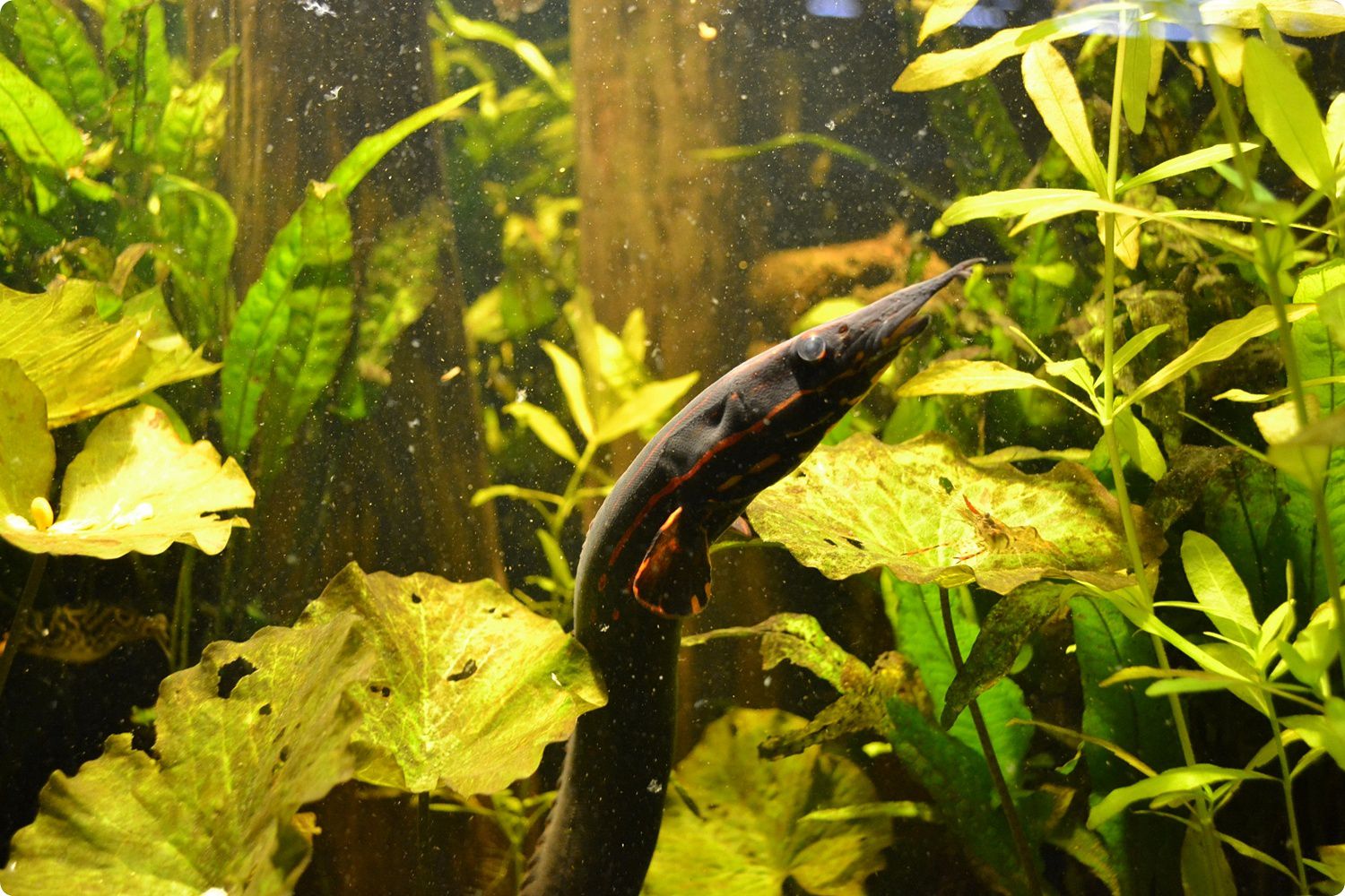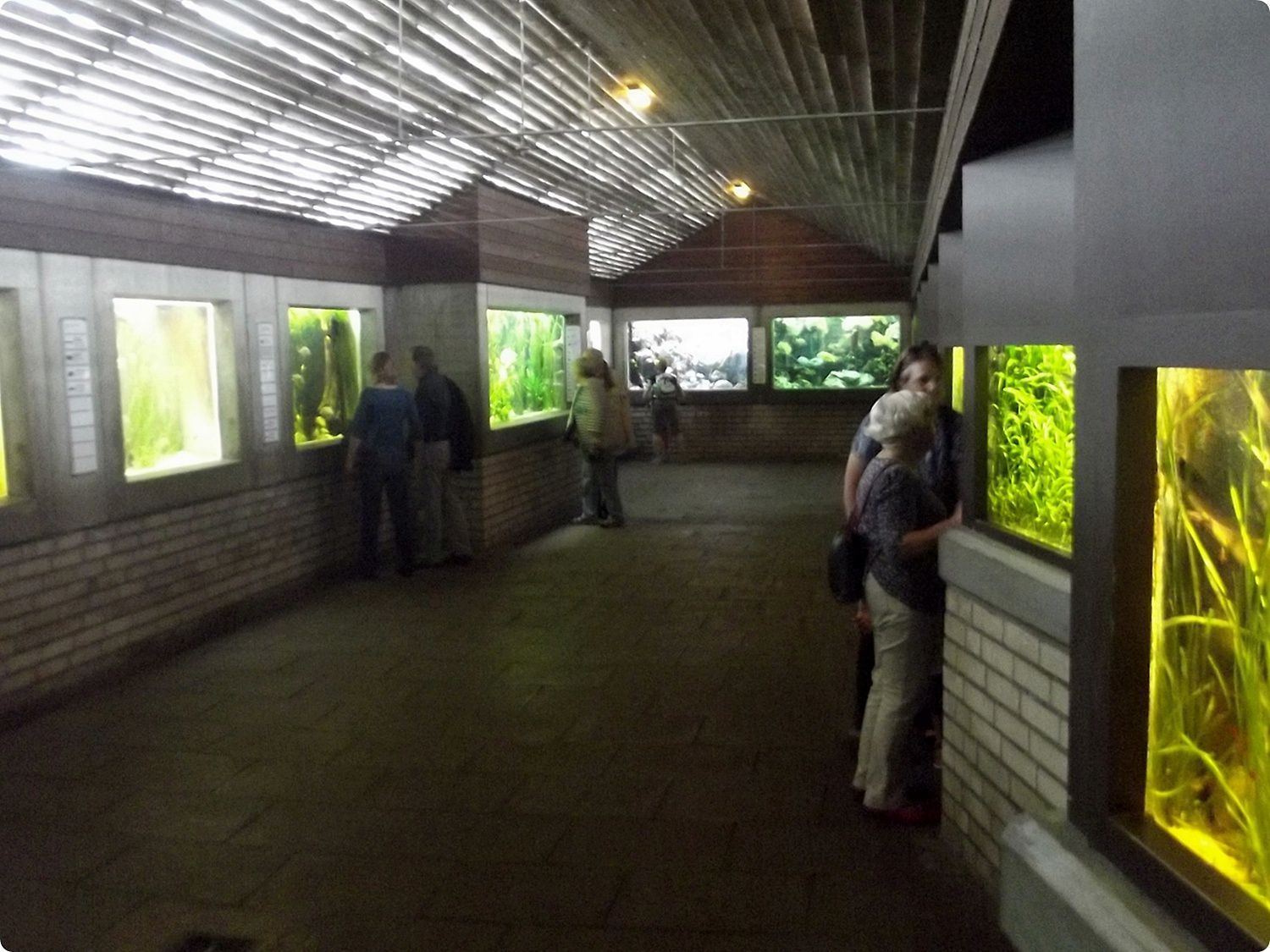 Az Akvárium látogatói folyosója és egyik lakója, egy vörössávos tűzangolna (Mastacembelus erythrotaenia). Az állatkert Akvárium-Terrárium épületét 1927-ben nyitották meg, Nyugat-Németország első akváriumaként. Az első jelentősebb felújításra 1974-ben került sor. A medencék össztérfogata 9000 liter, az állatok 14 kisebb és 11 nagyobb akváriumban kerülnek bemutatásra. A bemutatóban trópusi tengeri és trópusi édesvízi hal- és gerinctelenfajok egyaránt megtekinthetők.
