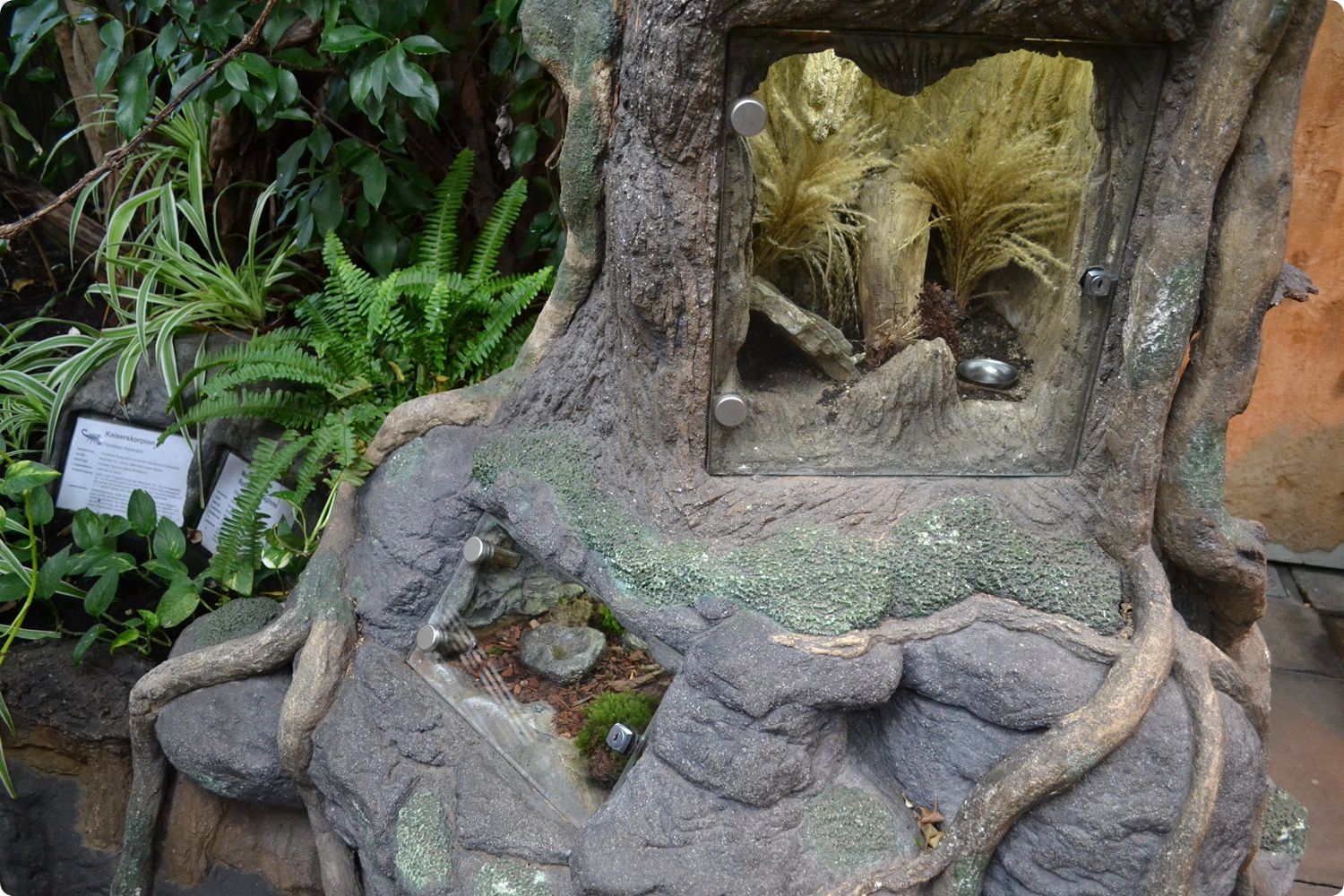 A képen látható különleges terrárium megjelenésében fatörzset utánoz. Elkészítéséhez valódi fát nem használtak, teljes egészében mesterségesen lett kialakítva. A felső terráriumban egy madárpókfaj, az alsóban pedig egy skorpiófaj kerül bemutatásra.